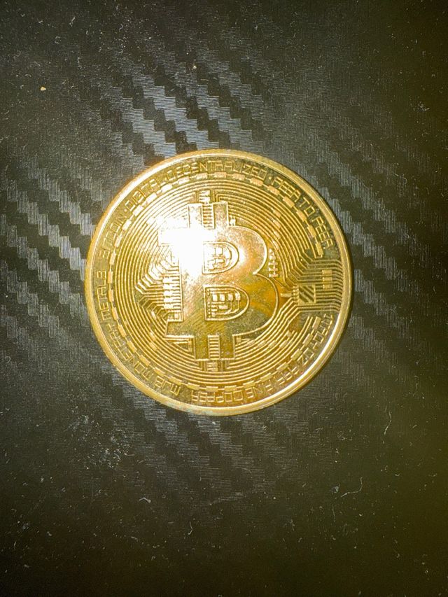 Réplica de moneda Bitcoin con acabado dorado. Un objeto coleccionable con un diseño detallado. - Acabado chapado en oro. - Diseño inspirado en Bitcoin.