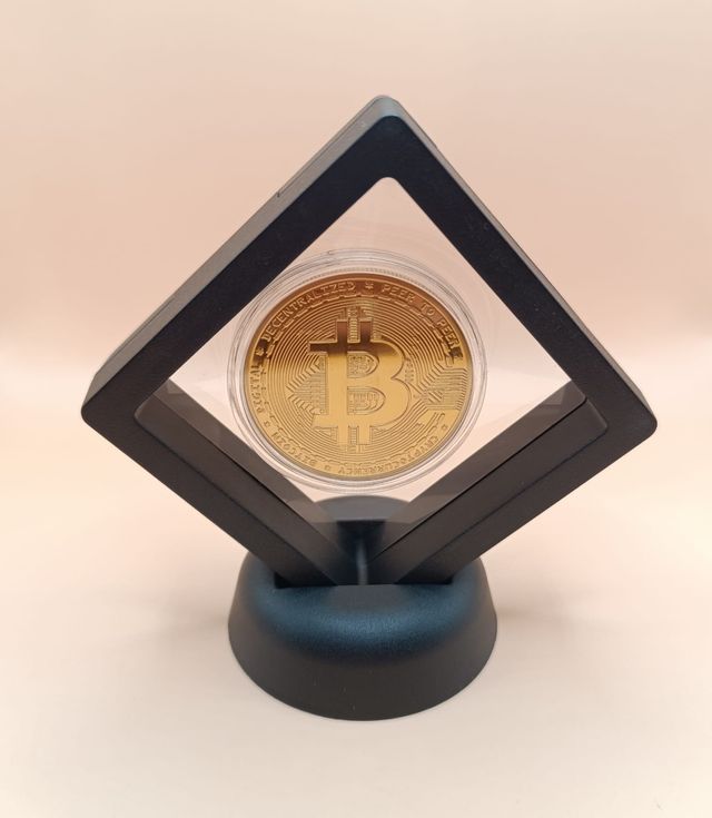 Moneda física conmemorativa Bitcoin de 40mm bañada color oro, con protector acrílico redondo en soporte cuadrado y base.