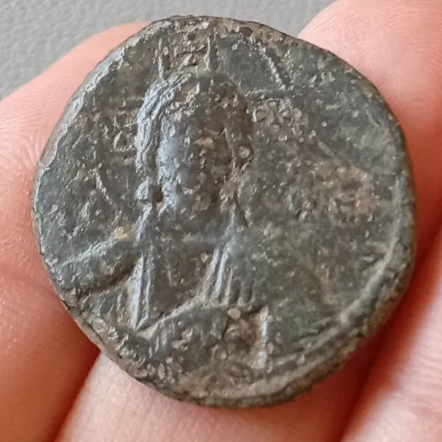 Detalles del productoEspectacular moneda Bizantina con la imagen de Jesucristo Pantocrátor. 28mm Acuñada en bronce a martillo.