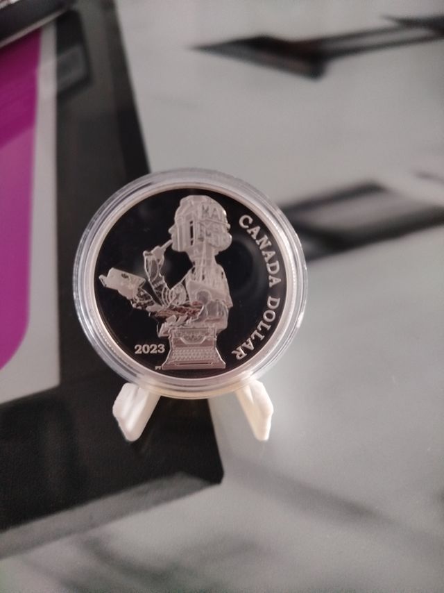 Moneda conmemorativa de Canadá del año 2023. - Diseño detallado de una figura con una máquina de escribir. - Inscripción CANADA DOLLAR y 2023.