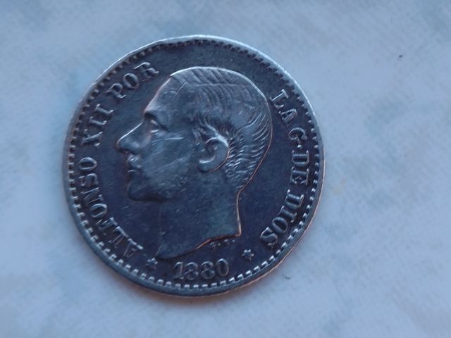 Moneda de plata de 1880 de cincuenta céntimos de peseta de Alfonso XII estrellas 8*0 bien visibles.Peso 2,5 gramos.Diametro 18,5 mm.canto estriado