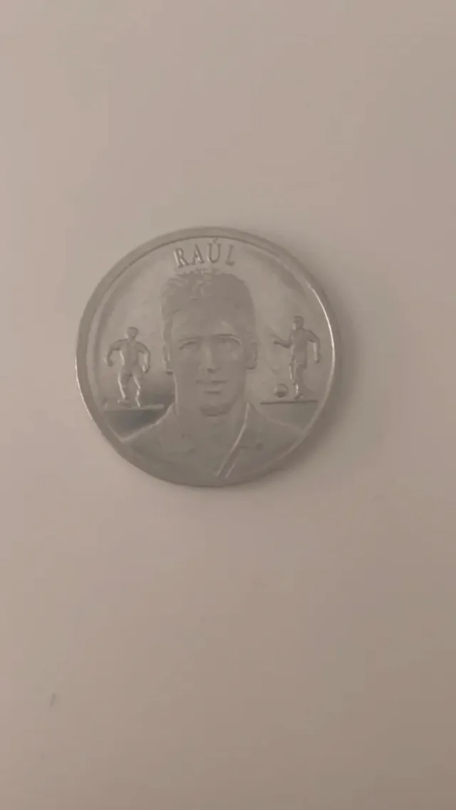 Moneda conmemorativa con la imagen de Raúl. - Diseño con figura de futbolista. - Borde con motivos de fútbol.