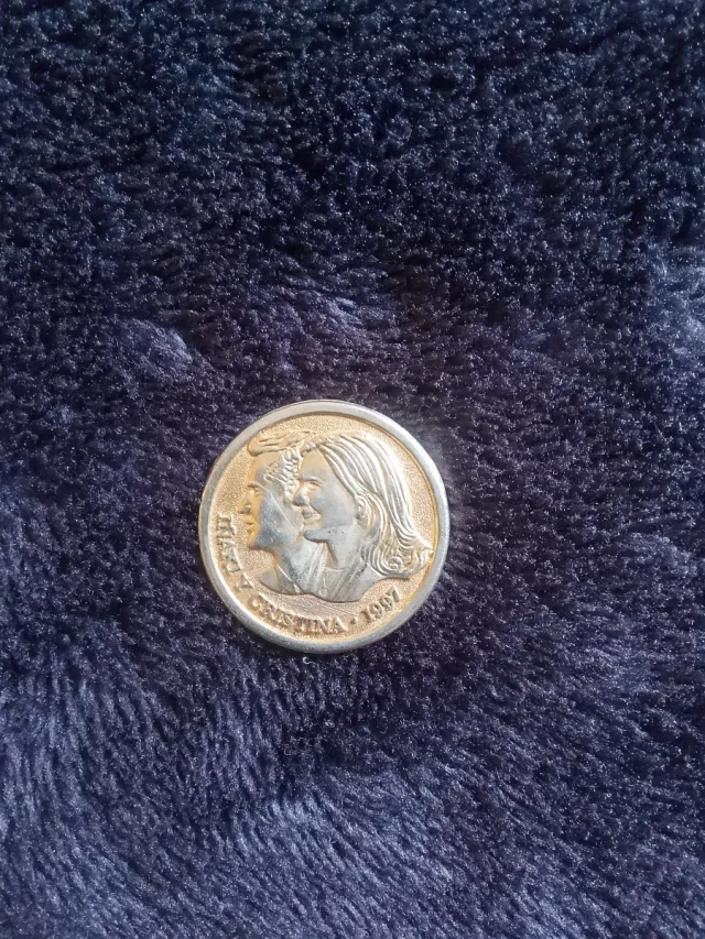 Moneda conmemorativa con un diseño grabado. - Presenta perfiles de dos personas. - Grabado MARIA CRISTINA - 1997 en el borde.