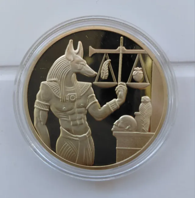 Detalles del productoMoneda conmemorativa con la figura de Anubis, en metal Dorado mate y brillo, anverso figura de Anubis con sus herramientas de modificación, reverso Anubis recostado con pirámide y jeroglíficos. Presentada en estuche transparente. Medidas 4 cm de diámetro. Nueva en perfecto estado.