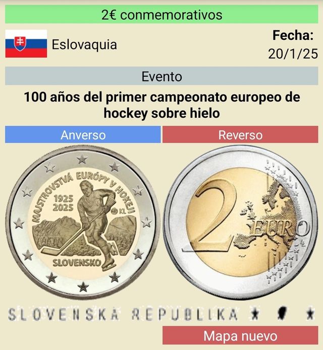 Detalles del productoMoneda conmemorativa de dos euros Eslovaquia 2025, 100 años del priner campeonato europeo de hockey sobre hielo, sin circular, todas las monedas sacadas de rollo y manipuladas con guantes. Más monedas en mi perfil.