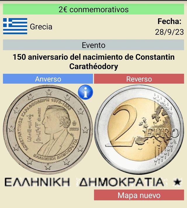 Detalles del productoMoneda conmemorativa de dos euros Grecia 2023, 150 Aniversario del nacimiento de Constantin Caratheodory, sin circular. Todas las monedas sacadas de rollo y manipuladas con guantes.