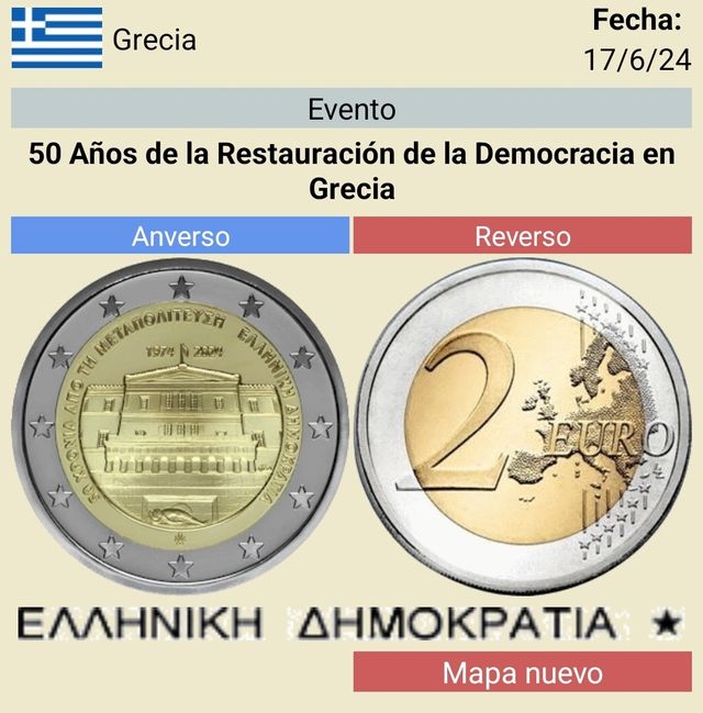 Detalles del productoMoneda conmemorativa de dos euros Grecia 2024, 50 años de la restauración democrática en Grecia, sin circular.Todas las monedas sacadas de rollo y manipuladas con guantes más monedas en mi perfil.