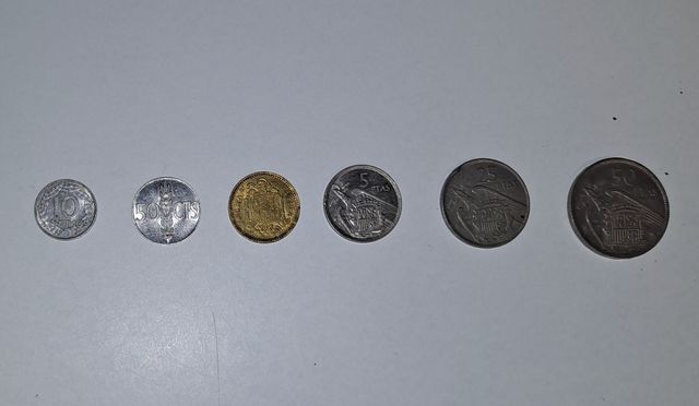 Moneda de 10 cts, 50 cts, 1, 5, 25 y 50 pesetas de Franco.