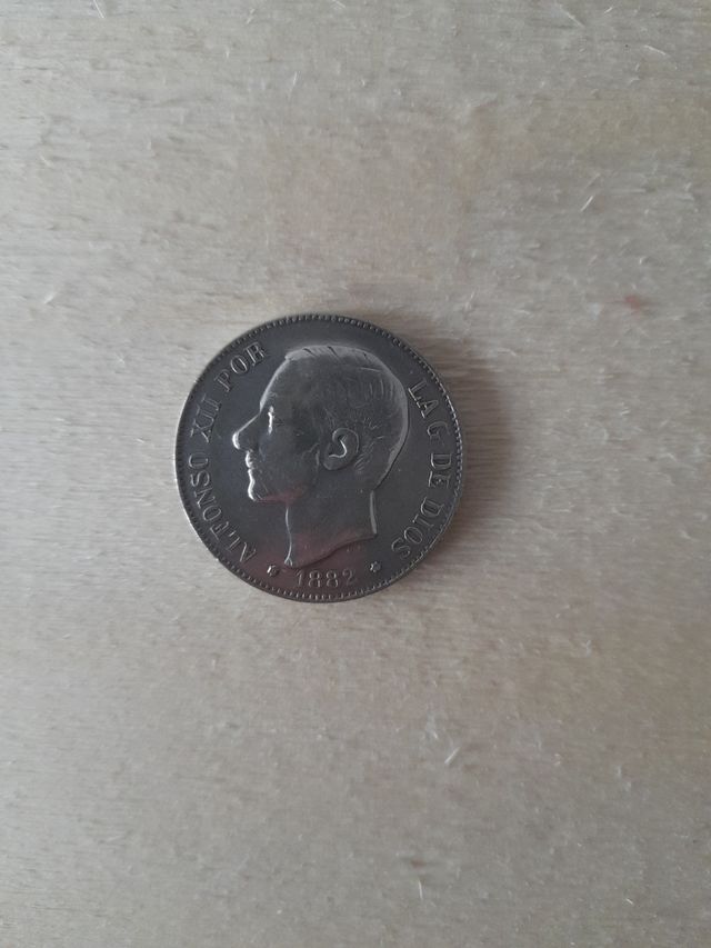 Moneda 5 pesetas de plata,Alfonso X|| de 1882.pesa 26gr,diámetro 37cm grosor2mm.Relieves en canto.Sin circular se aprecia en fotos. Escucho ofertas.