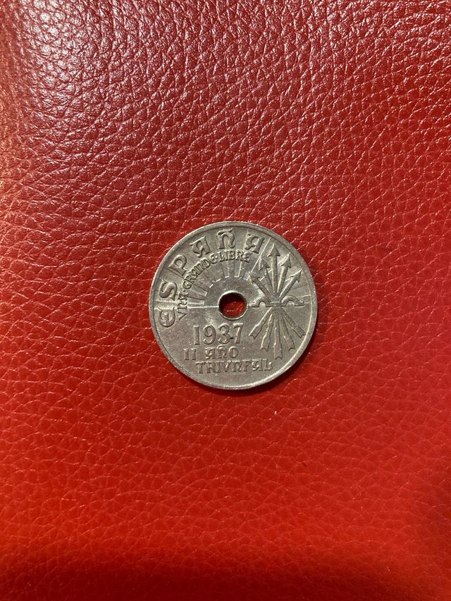 Moneda conmemorativa de España del año 1937. - Diseño con el escudo y el año. - Año Triunfal grabado en la moneda.