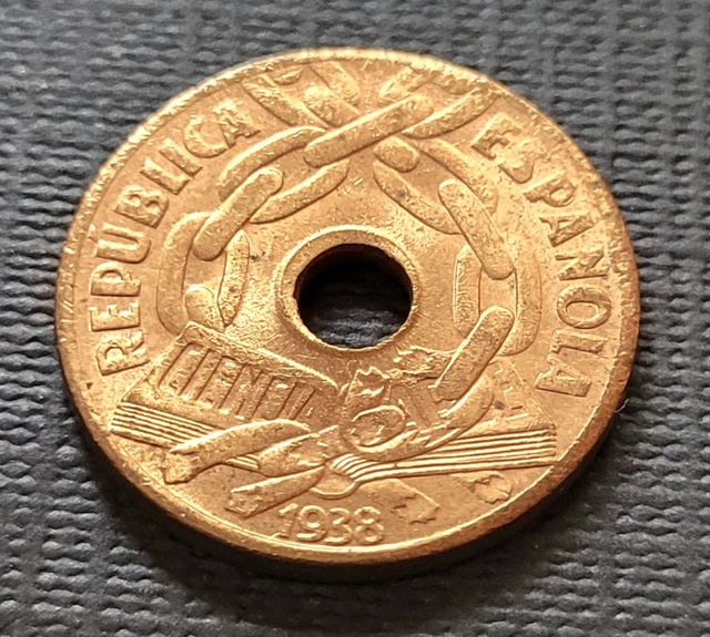 Detalles del productoMoneda de 25 cent de España de 1938. Es una moneda antigua, con señales de desgaste propias del tiempo.