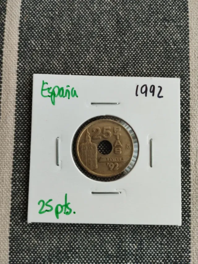 Detalles del productoMoneda de España 25 pts 1992 Sevilla. Moneda circulada pero en buen estado. Precio 0.80 euros. Envío mínimo seis unidades.