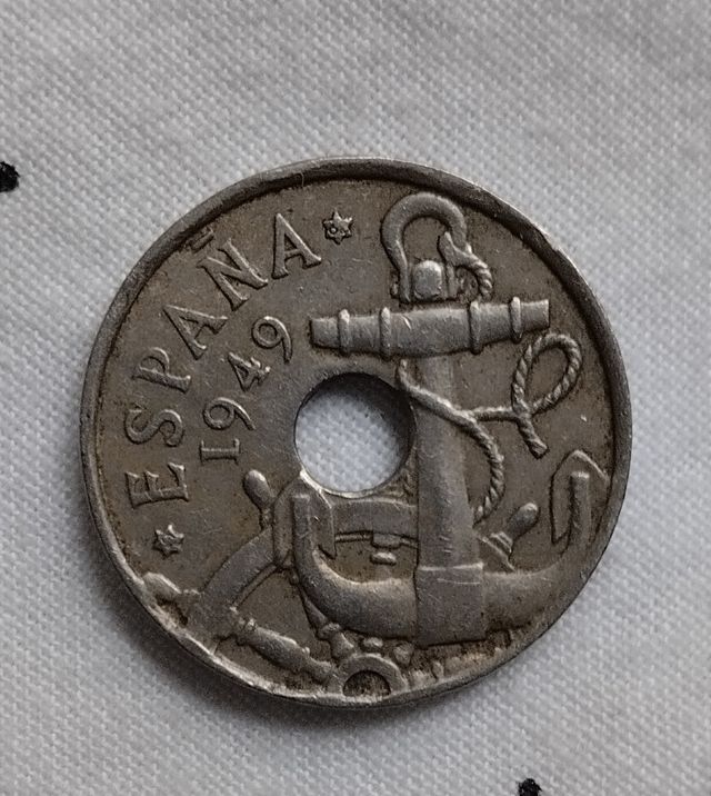 Detalles del productoSe ofrece moneda de 50 céntimos de España, acuñada en 1949. Es una pieza antigua con un ancla en el diseño. - Moneda de 50 céntimos de España. - Año de acuñación: 1949. - Diseño con ancla. - Se encuentra en buen estado de conservación.