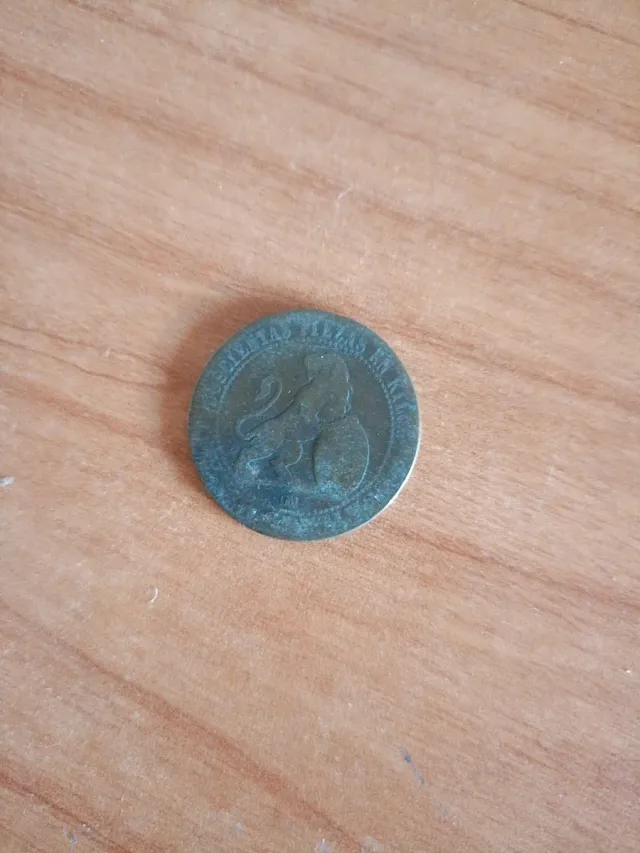 Moneda antigua española con fecha de 1870. - Diseño con león y escudo. - Borde con inscripciones.