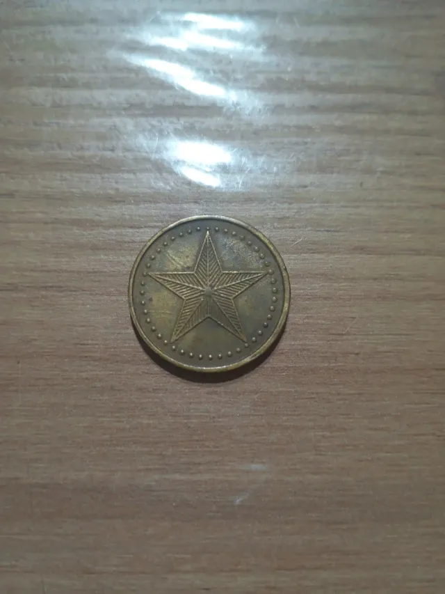 Moneda con un diseño de estrella central, rodeada por un borde de puntos. - Diseño de estrella. - Borde con puntos.