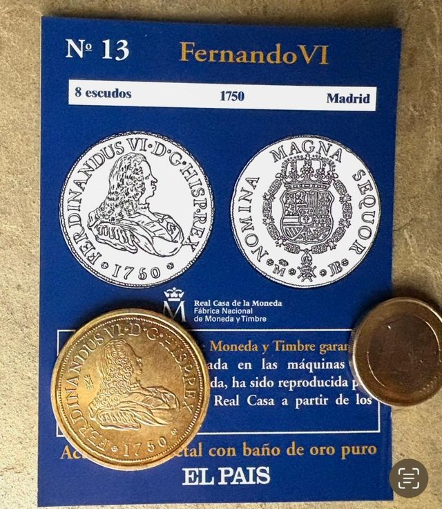 Detalles del productoReproducción de moneda de 8 escudos de Fernando VI, acuñada en Madrid en 1750. Presenta un baño de oro puro.