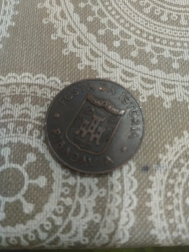 Detalles del productoMoneda conmemorativa de la Festa da Historia del año 1972. Presenta un escudo con un castillo en relieve.