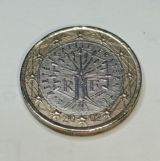 Edición de la moneda europea en Francia de 1 Euro acuñada en 2002. Está compuesta por ciproniquel
