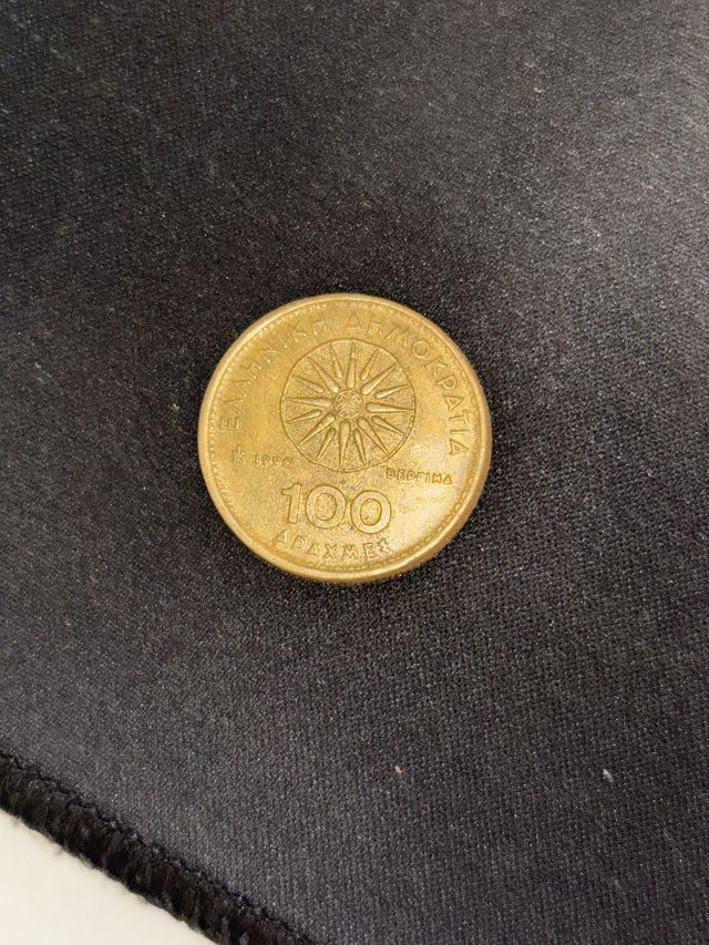 Moneda de 100 dracmas de Grecia. - Diseño con el sol de Vergina. - Año 1990.