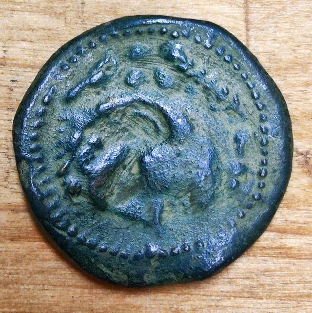 Pieza numismática de época Ibero Romana. - Diseño con busto en relieve. - Borde con perlas o puntos. - Material de bronce o similar.