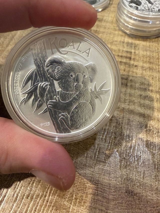 Moneda de plata con diseño de koala. 2 unidades disponibles - Año: 2024 - Peso: 1 oz - Pureza: 9999 Plata - Diseño: Koala en árbol