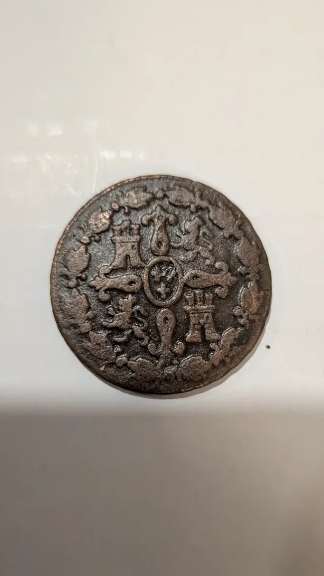 Detalles del productoMoneda antigua de maravedís, con un diseño detallado y un acabado de bronce.