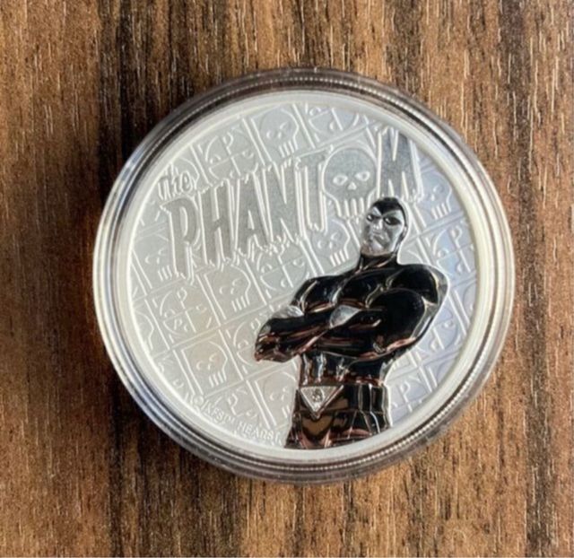 Detalles del productoMoneda de plata de 1 onza conmemorativa de The Phantom, año 2022. Diseño detallado del personaje.