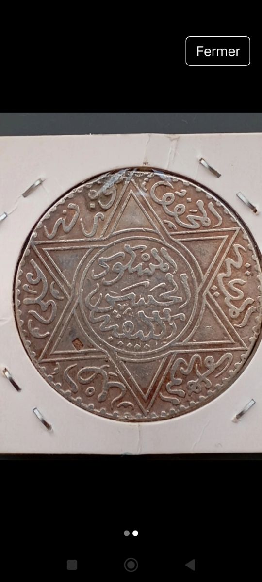 Moneda de plata de 10 dirhams de Marruecos, acuñada en el año 1881. - Diseño con estrella de seis puntas. - Inscripciones en árabe.
