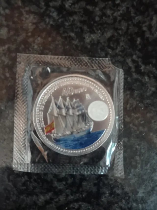 Moneda de plata conmemorativa. - Diseño de un barco de vela. - Detalle de la bandera de España. - Valor facial de 40 euros.año 2025