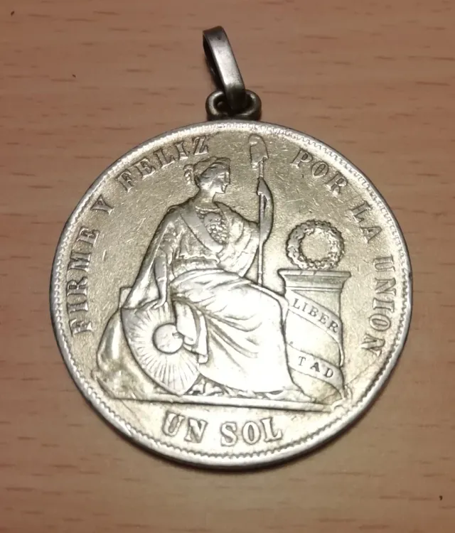Moneda de plata peruana de 1869, con un diseño detallado y un enganche para poder colgarla. - Plata 900. - Año 1869. - Moneda bien conservada.