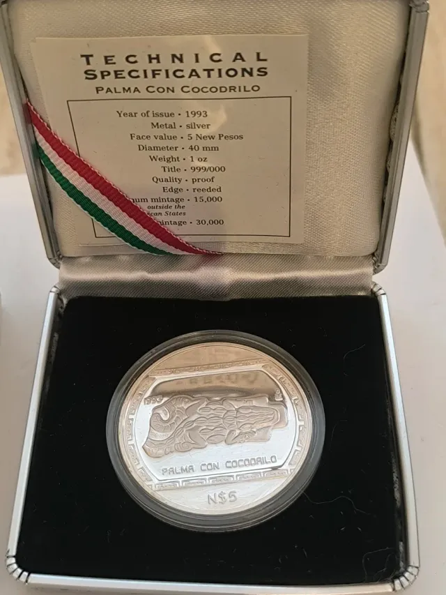 Detalles del productoMoneda conmemorativa de plata de México de 1993, con la temática Palma con Cocodrilo.