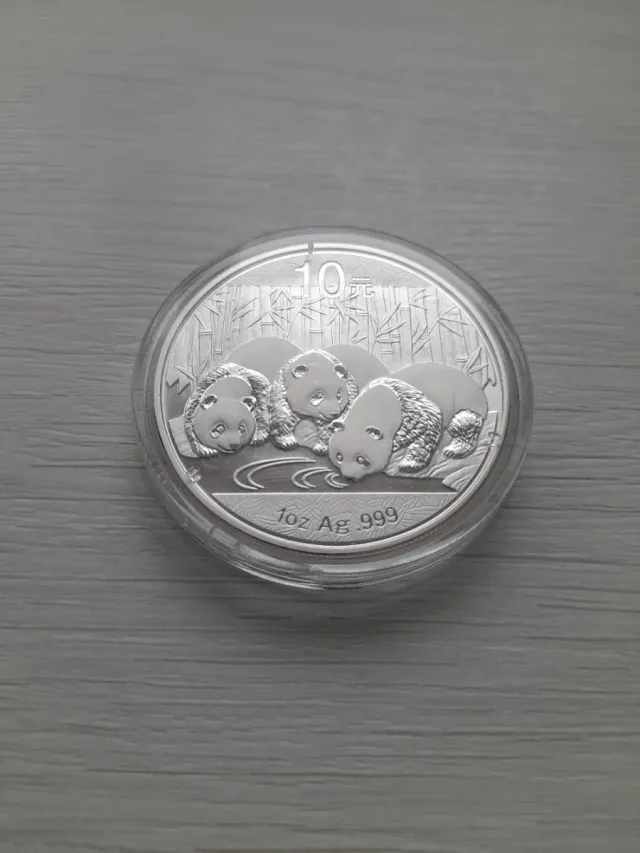 Moneda de plata de la serie Panda de China, año 2013. - Peso: 1 onza (oz). - Metal: Plata. - Pureza: 999.