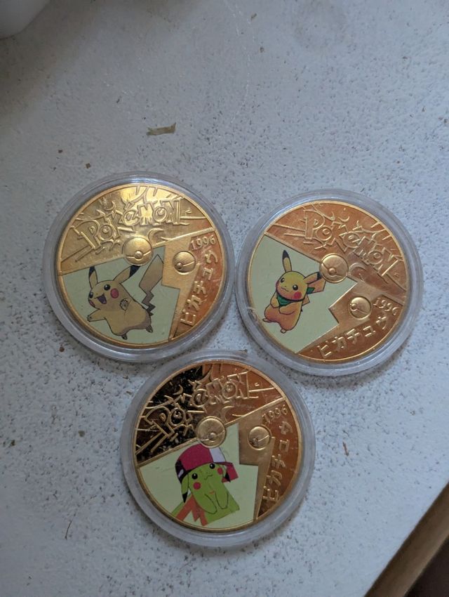 Monedas conmemorativa de Pokémon de 1996. - Diseño de Pikachu. - Acabado en oro. - Inscripción en japonés.