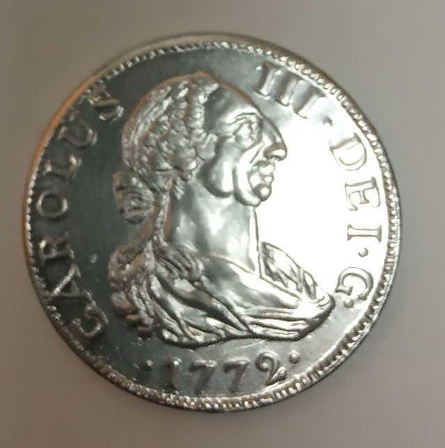 Detalles del productoReproducción exacta de moneda, réplica de Carolus III, año 1772, 8 reales. Escudo coronado de castillos y leones con escusón de los Borbones, 40 mm. de diametro.
