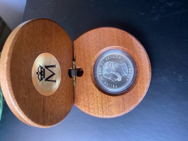 Detalles del productomoneda plata del rey Felipe VI conmemorando su 10 aniversario de la coronación , en capsulada y en caja de madera de la casa de la moneda