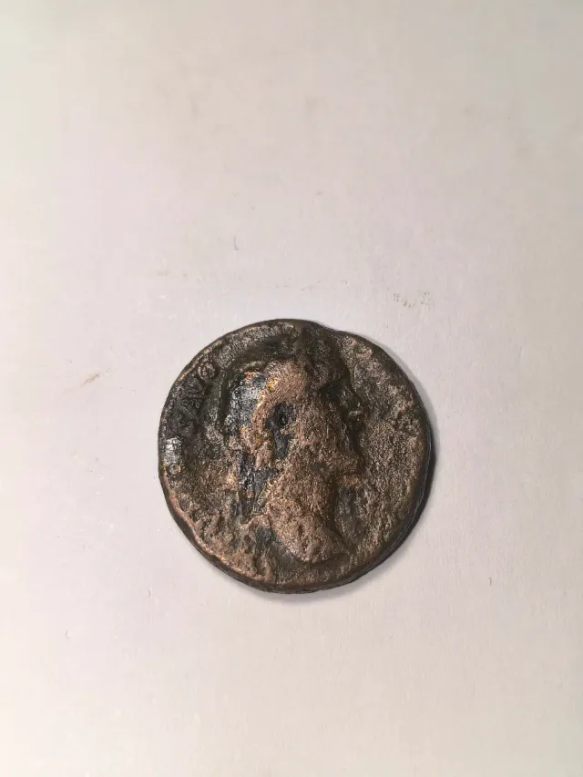 Moneda antigua de origen romano. Presenta un diseño detallado en relieve. - Material: Bronce - Diseño: Retrato imperial