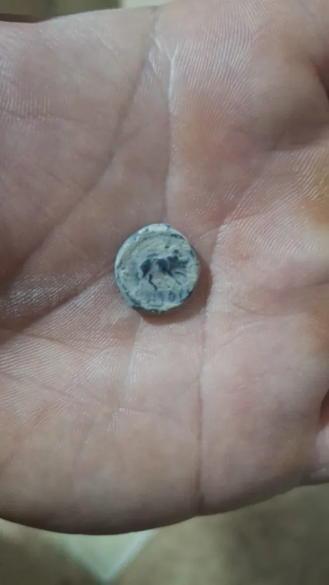 Moneda antigua de origen romano. Presenta un diseño grabado. - Diseño de animal. - Inscripción parcial visible.