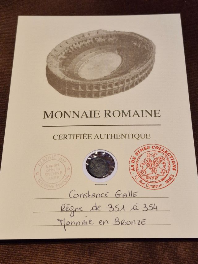 Detalles del productoMoneda romana de bronce del emperador Constancio Galo (Flavius Claudius Contantius Gallus (351-354). Comprada en la localidad francesa de Nimes. Dispone de certificado de autenticidad. Entrega en mano en Alcorcón o envío a través de wallapop.