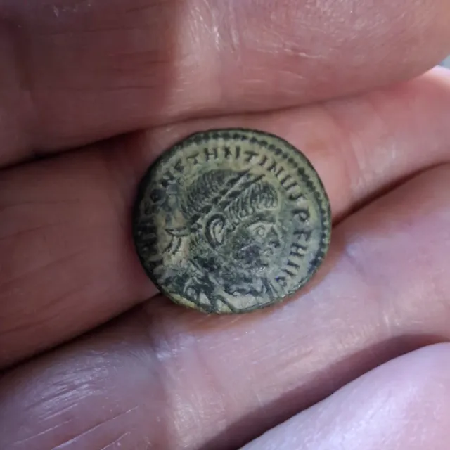 Moneda antigua del emperador romano Licinio I. - Representación del emperador. - Inscripción en el borde.