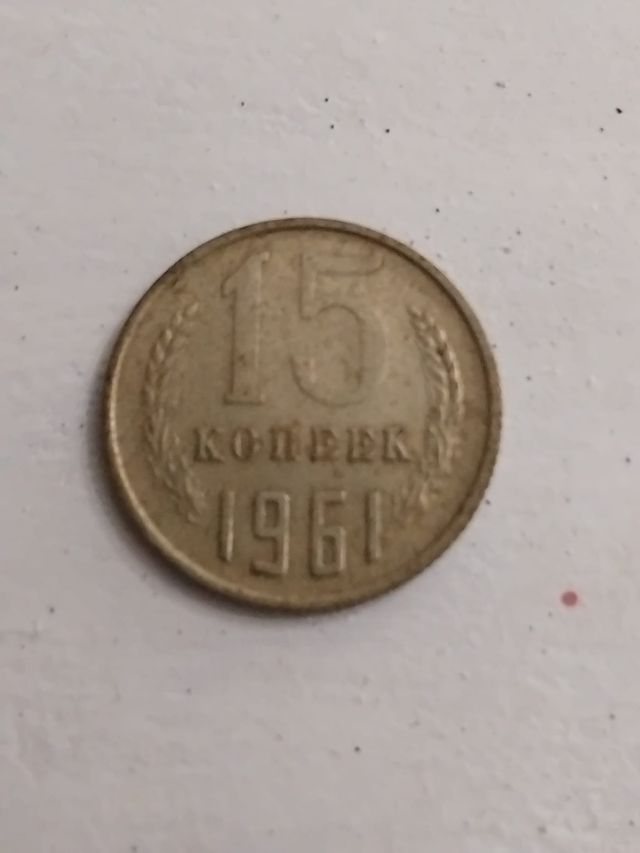 Moneda de 15 kopeks de la Unión Soviética, acuñada en el año 1961. - Diseño con espigas de trigo. - Inscripción 15 КОПЕЕК y el año 1961.