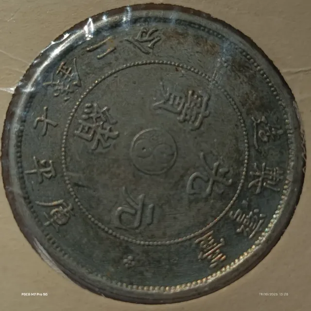 Moneda antigua de la provincia de Taiwán, acuñada durante la Dinastía Qing. - Diseño con caracteres chinos. - Símbolo Yin Yang en el centro.