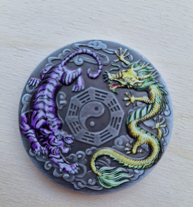 Moneda Tigre y Dragon en color. reverso yin yang dos fuerzas opuestas que forman un todo. perfecta para regalar si te gustan las monedas y la filosofía china.