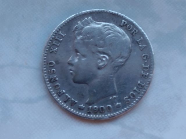 Moneda de plata de una peseta del año 1900 de Alfonso XIII. Peso 5 gramos. Diámetro 23mm. Canto estriado y en perfecto estado.