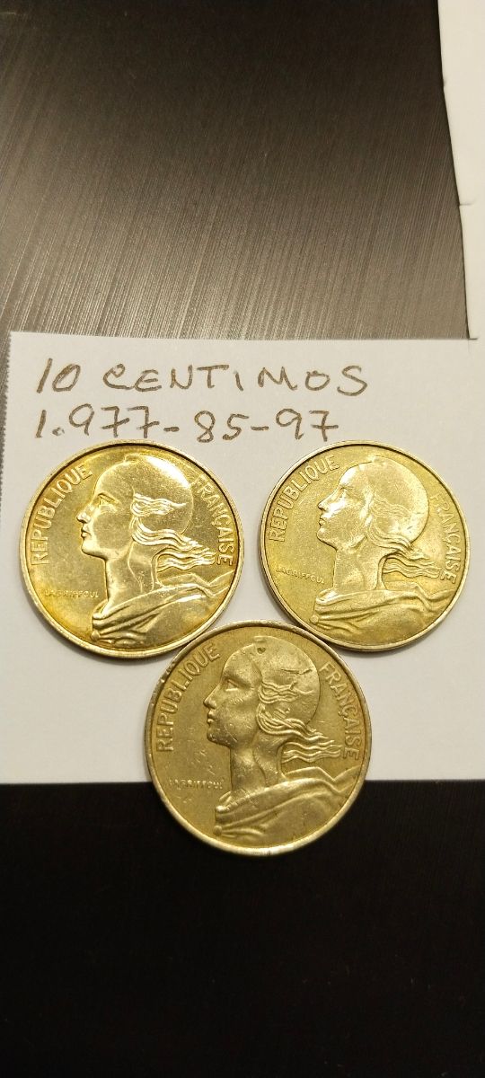 Monedas de 10 céntimos franceses, años 1.977-85-97.