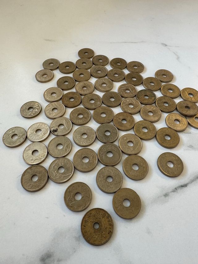 Conjunto de monedas de 25 pesetas con el característico agujero central. 60 monedas - Monedas de colección. - Diseño con agujero. - Ideal para numismáticos.