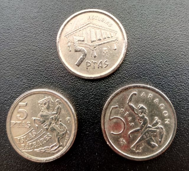 Moneda 5 pesetas 1995 Asturias. Moneda 5 pesetas 1997 Islas Baleares. Moneda 5 pesetas 1994 Aragón. Buen estado. Se venden juntas o por separado. Precio a convenir.