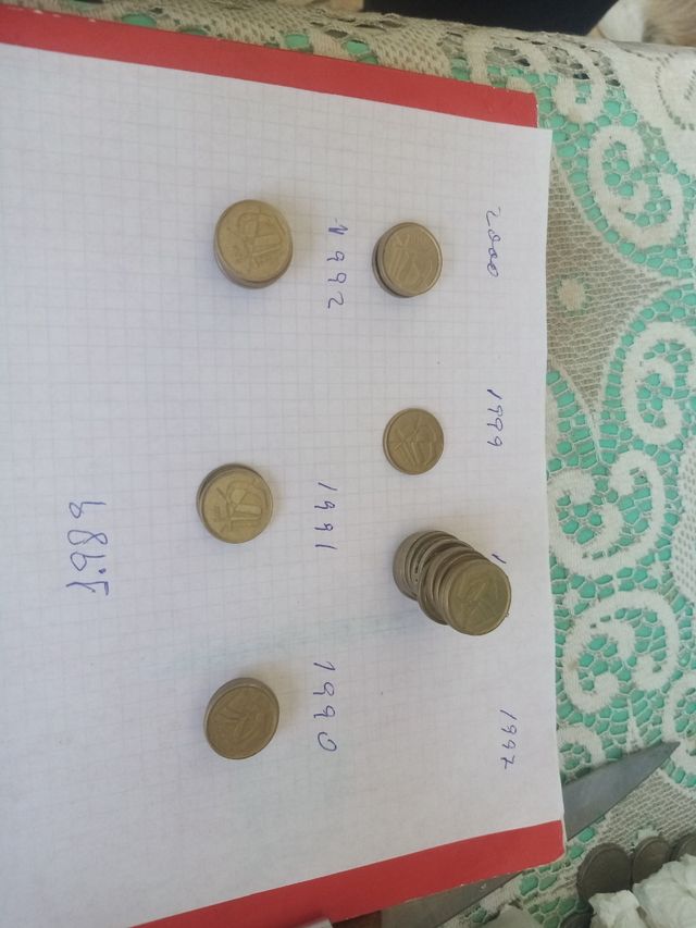 Detalles del productoMonedas de 5 pesetas españolas de los años 90, 91, 92, 98, 99 y 2000. Se aprecian en buen estado. En total hay 32 monedas. Las de la fotografía adjunta, pago y envío por Wallapop. Envío separadas por año de acuñación.