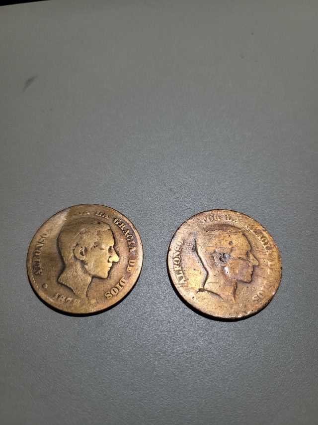 - La otra moneda muestra Alfonso XII por la Gracia de Dios y parte de la fecha.