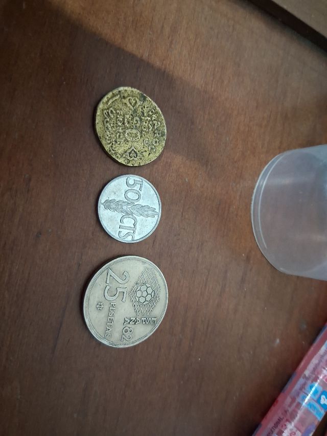 - Una moneda de 25 pesetas con un diseño de una portería.