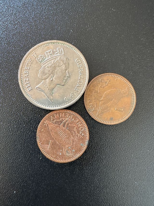 Me gustaría vender estas monedas antiguas de Gibraltar. - Incluye tres monedas. - Las monedas tienen un aspecto usado, pero se conservan bien.